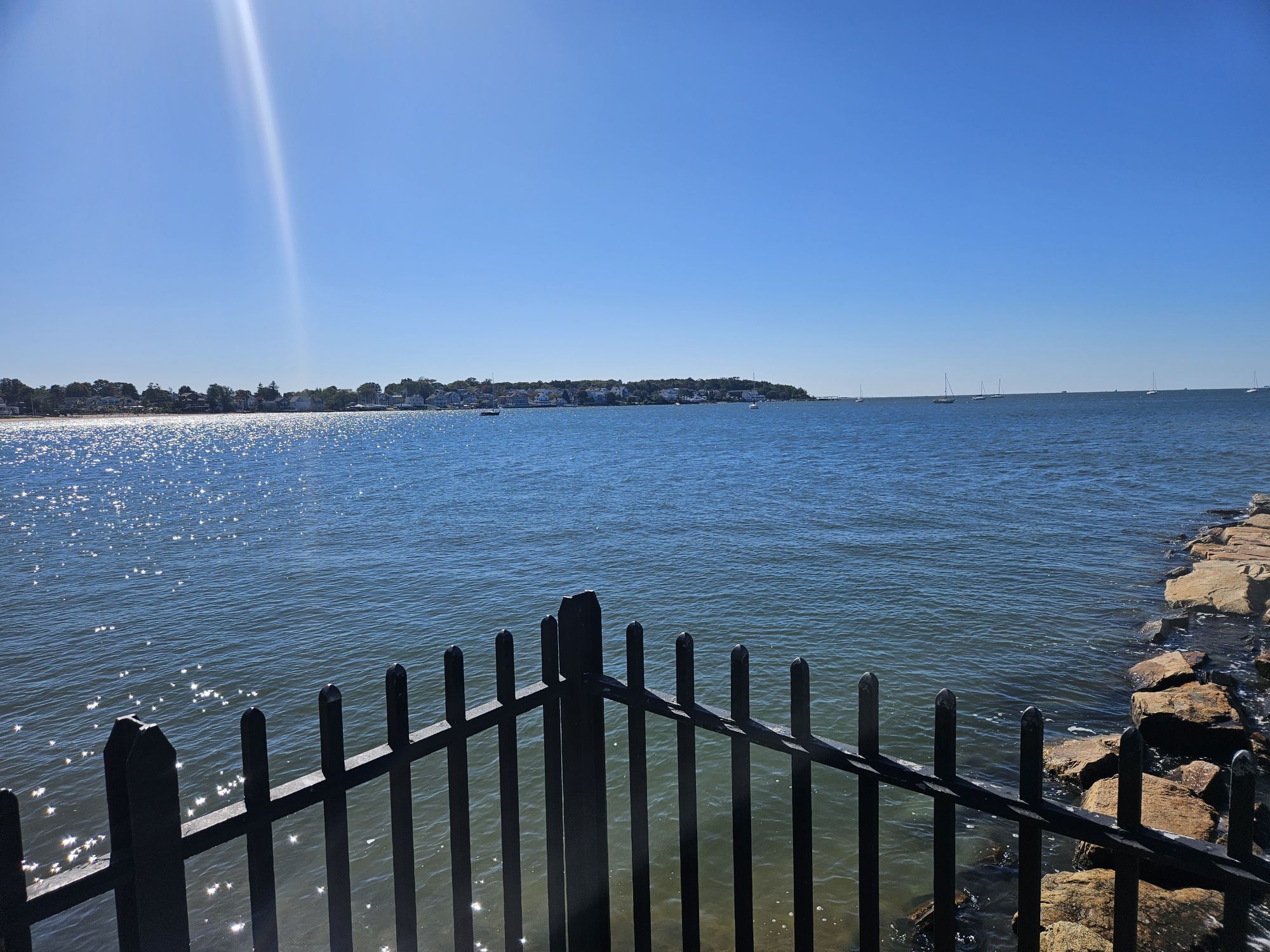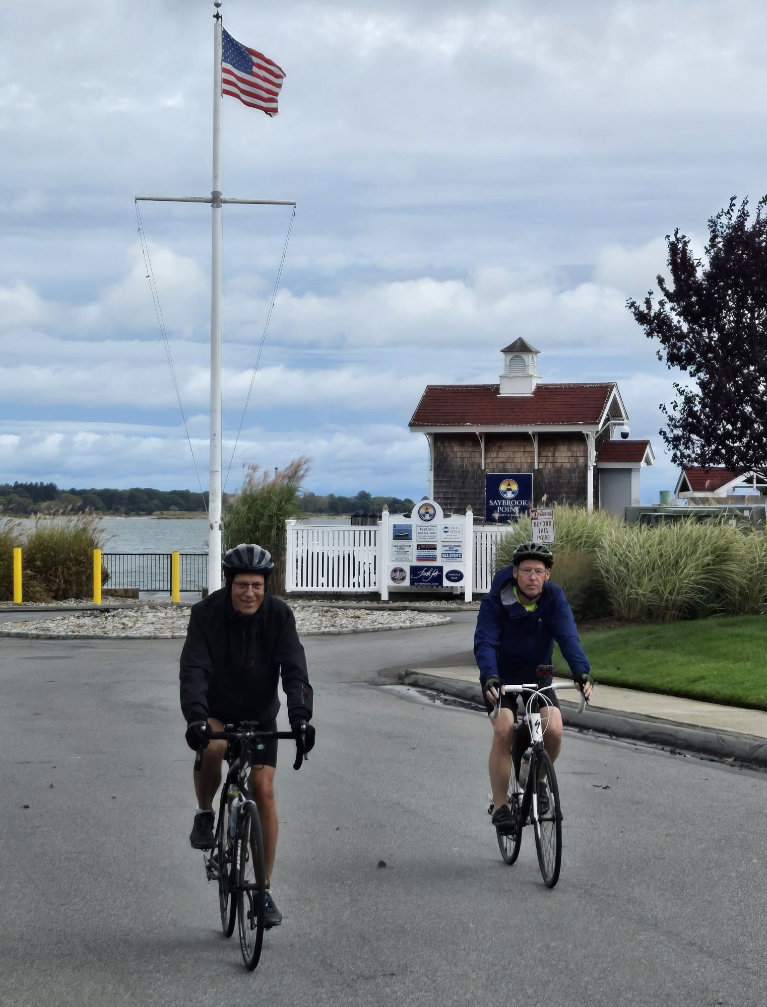 We left the Cathedral, and headed towards Westbrook CT by way of Salem, Lyme, Old Saybrook, and Essex (all in CT). The ride included Saybrook Point, one of our favorite places to ride. Note the flag in the background of the photo below - you can see how windy it is!